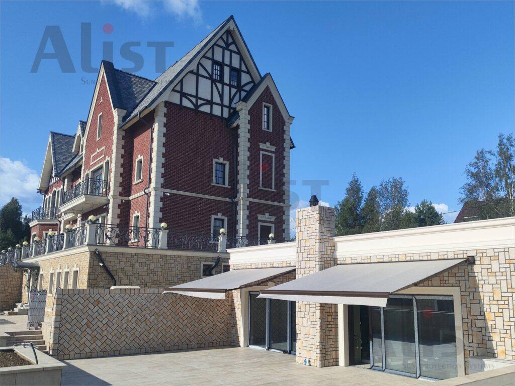Полукассетная выдвижная маркиза для террасы загородного дома.
